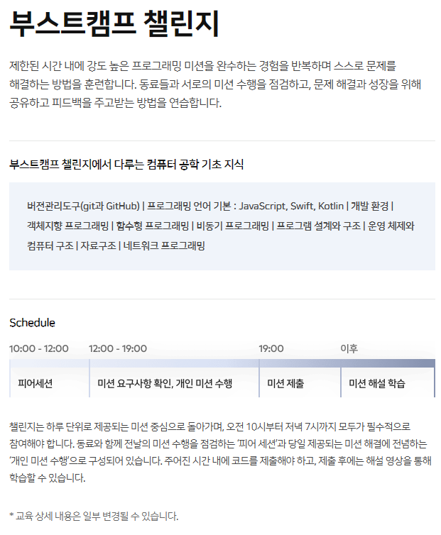 부스트캠프 챌린지에서는 매일 미션을 수행하고 다음날 피어세션을 통해 서로의 미션 수행을 점검한다.