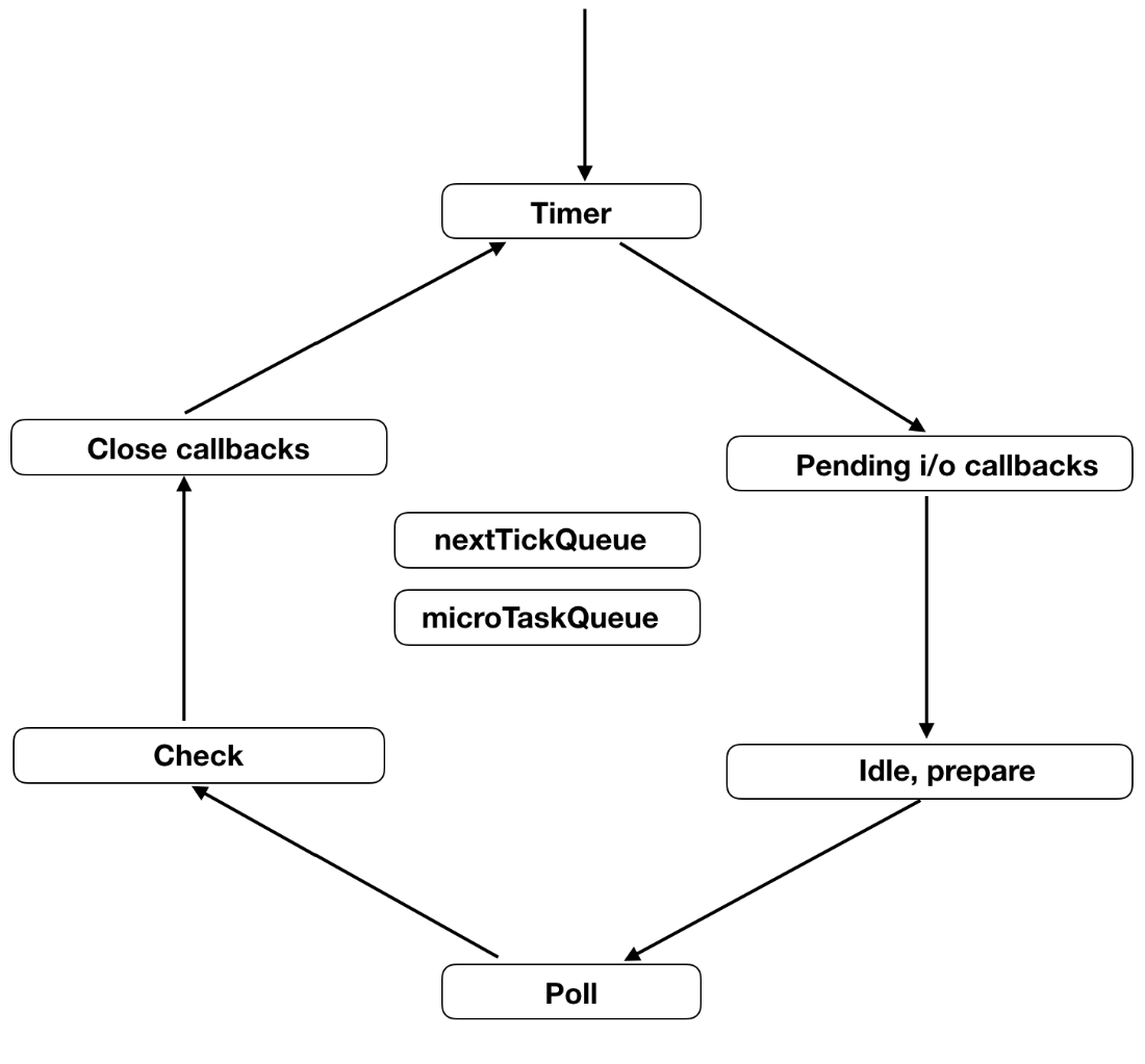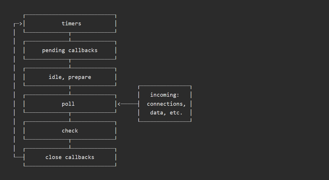 이벤트 루프는 6단계로 이루어져 있으며 각 단계는 각각 이벤트 큐를 갖는다.