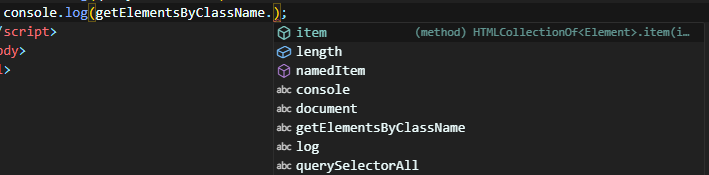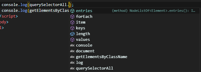 VSC에서 사용 가능한 메소드를 확인해보면 NodeList에 사용할 수 있는 메소드가 더 많은 것을 확인할 수 있다.