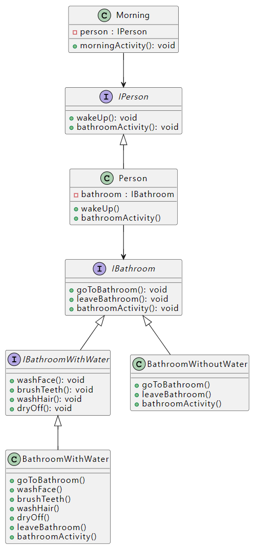 BathroomWithoutWater 클래스는 IBathroom을 구현하게 될 것이고 나머지 필요없는 메소드도 구현해야 한다.