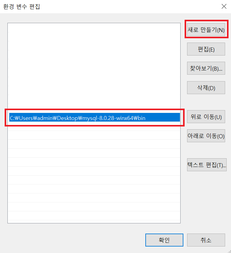 새로 만들기를 눌러 MySQL의 bin 폴더의 경로를 추가해주면 된다.