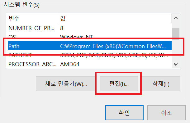 시스템 변수에서 Path를 찾아 편집을 누른다.