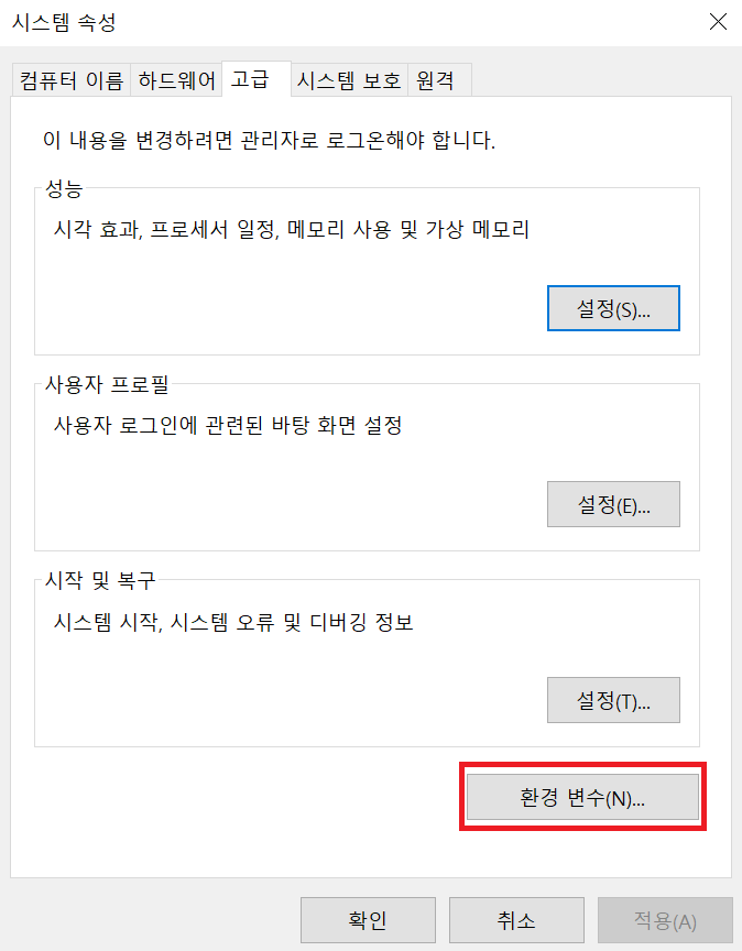 시스템 속성 창이 나오는데 '환경 변수'에 들어간다.