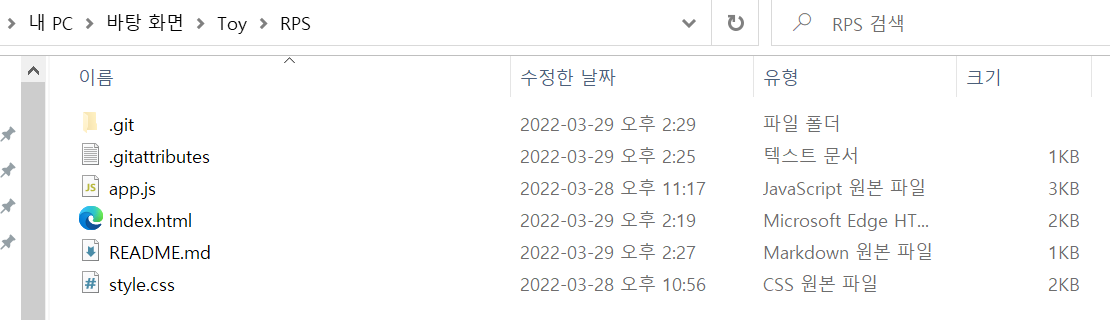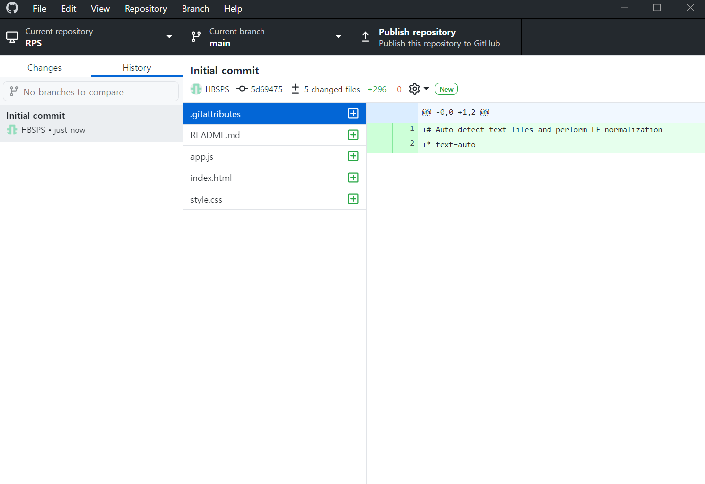 원래 없던 .gitattribute, README.md 등의 파일이 생성되고 변경 사항들이 commit되어 있는 것을 확인할 수 있다.