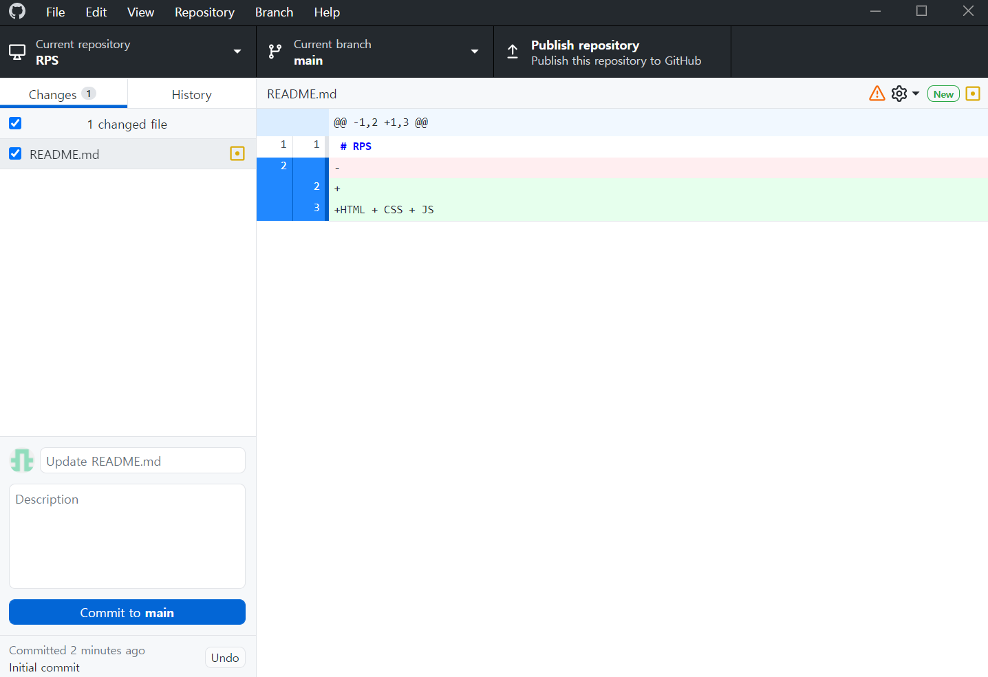 README.md를 수정하고 다시 GitHub Desktop을 보면