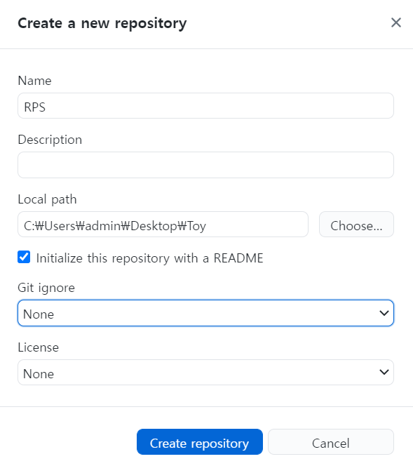 (본인의 경우 프로젝트 폴더인 RPS 폴더가 C:\Users\admin\Desktop\Toy\RPS에 위치하므로 Name에는 RPS를, Local Path에는 바로 위 경로인 C:\Users\admin\Desktop\Toy를 적는 것이다)