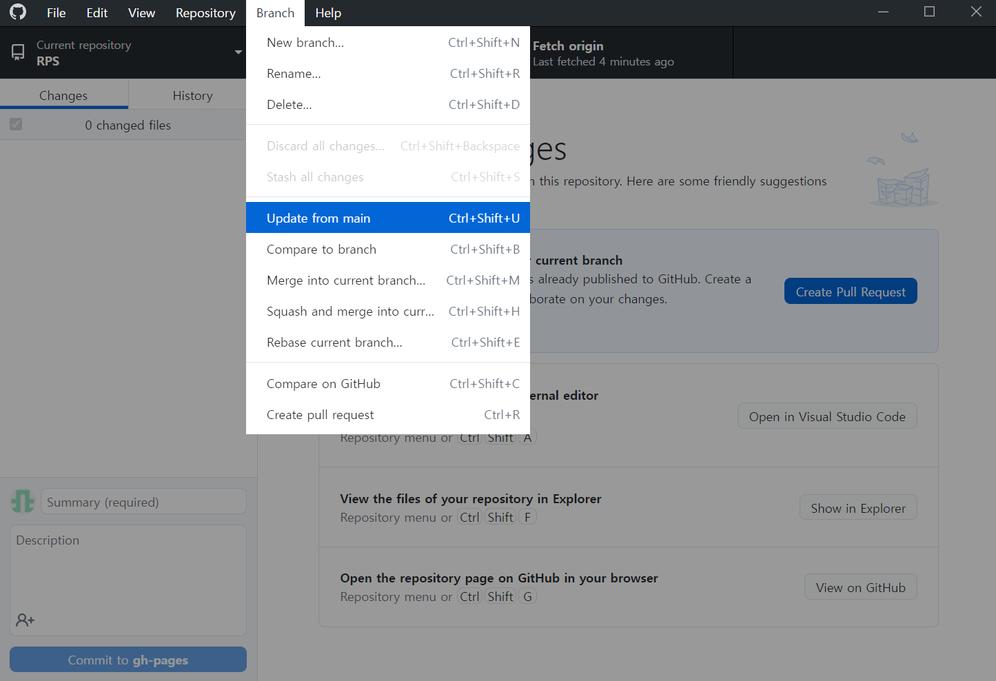 Branch 메뉴의 Update from main을 누르면 main에서 수정 및 commit했던 사항들이 gh-pages branch로 넘어와서 commit된다. 이후 push해주면 gh-pages에도 잘 적용된다.