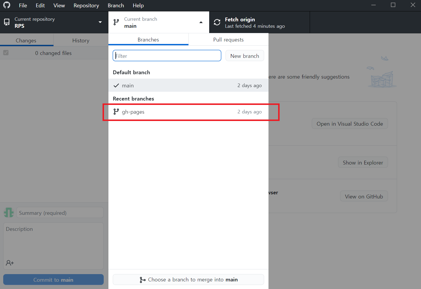 우선 GitHub Desktop을 실행시킨 후 작업 대상 레포지토리로 이동한다.
